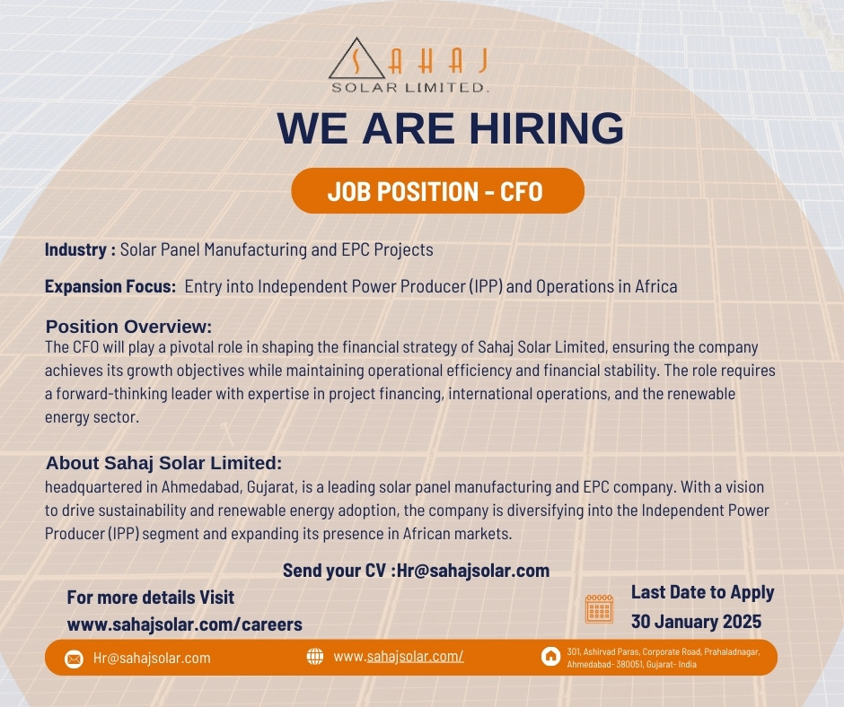 Join the leading force in renewable energy with Sahaj Solar Limited We’re seeking passionate and driven individuals who are dedicated to fostering a sustainable future. At Sahaj Solar Limited, your innovative spirit and commitment to excellence will thrive as you contribute to powering homes and businesses while advancing a cleaner, greener planet. Submit your CV today and start your journey with us. Take the first step toward a fulfilling and impactful career—apply now and be a part of the renewable energy revolution with Sahaj Solar Limited.