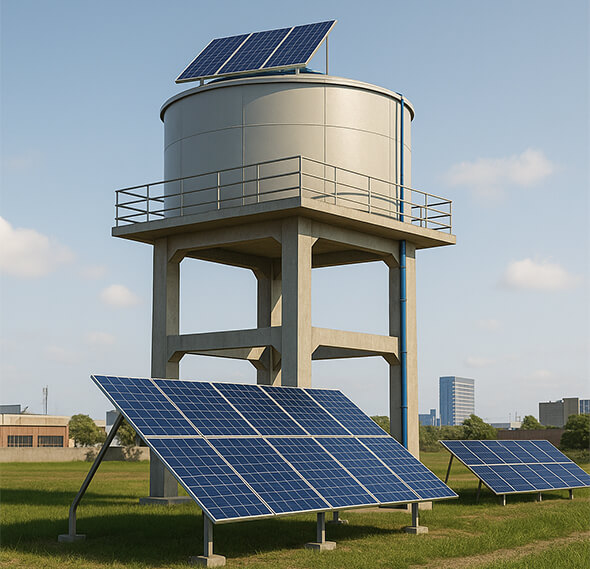An overhead water tank structure is crucial for effective water management, ensuring a steady and reliable supply. Elevated on supports or a tower, this design utilizes gravity to facilitate water distribution, minimizing the need for additional pumps and enhancing water pressure throughout the system. At Veracity Energy and Infrastructure Private Limited (VEIPL), we excel in designing and manufacturing durable overhead water tank structures that meet stringent engineering and safety standards. Our expertly crafted tanks are ideal for a range of applications, from residential to commercial and industrial use. By combining quality materials with precision engineering, VEIPL delivers reliable and efficient water storage solutions that cater to the specific needs of our clients.